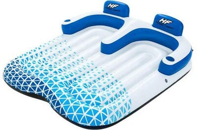 Morsom, oppblåsbar, blå, hvit Hydro-Force Indigo Wave Double Lounge flytemadrass fra Bestway med to innebygde koppholdere. Den har komfortable armstøtter og hodestøtter. – Mål: B 193 x L 196 cm. – CE-merket. – Anbefalt alder: fra 3 til 12 år. – 99,52 % PVC, 0,48 % PP-plast.