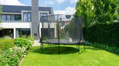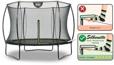 Svart Silhouette trampoline fra EXIT med et medfølgende sikkerhetsnett med bøyde stolper, slik at nettet blir spent opp. Den har kraftige fjærer som gir god sprett og styrke. Perfekt til å ha i hagen under sommermånedene. – CE-merket – Maksimal vekt: 50.0 kg – Undersøk trampolinen regelmessig for å sikre at den er i god stand og riktig montert. Bytt ut ødelagte nett og rammebeskyttelse umiddelbart – Anbefalt alder: fra 3 til 12 år