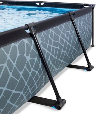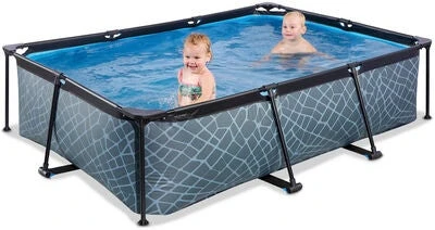 Rektangulært, grått svømmebasseng fra EXIT med en galvanisert, pudderlakkert stålramme. Det har tykke vegger i PVC for ekstra slitestyrke, og en effektiv filterpumpe som rengjør og sirkulerer vannet, slik at det holder seg friskt og klart for bad og lek. – Lav rammehøyde, som er enklere for små barn å komme seg over – 220x150x65 cm – CE-merket – Inkluderer: stålramme, filterpumpe. – Skal brukes under oppsyn av en voksen – Anbefalt alder: fra 6 til 12 år