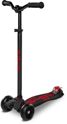 Lett, rød, svart Maxi Deluxe Pro sparkesykkel fra Micro i plast og aluminium med et sklisikkert dekk for ekstra stabilitet. Den har tre lettrullende hjul og et anodisert styre, som gjør det lett å manøvrere. – Mål: H 67 x B 11 x L 30 cm – CE-merket – Maksimal vekt: 70.0 kg – Anbefalt alder: fra 5 til 12 år