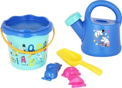 Sandsett fra Mummitrollet med en fargerik design. Det har en bøtte og ei vannkanne. Sandsettet har en spade og to sandformer. Perfekt for en dag på stranden, eller for leking i sandkassen. – CE-merket. – Anbefalt alder: fra 2 år. – PP-plast.
