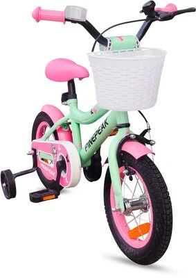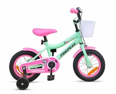 Barnesykkel fra Pinepeak med en fargerik design. Den har en kurv og støttehjul. Barnesykkelen har en håndbrems, en sykkelklokke, en heldekkende kjedebeskyttelse og reflekser. – 12 tommer. – CE-merket. – Maksimal vekt: 20 kg. – Anbefalt alder: fra 2 til 4 år. – 80 % metall, 10 % gummi, 10 % plast.