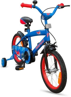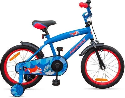 Fargerik, blå Shark sykkel av høy kvalitet fra Pinepeak med avtagbare støttehjul. Den har en håndbrems på forhjulet og en sykkelklokke foran. Sykkelen har en synlig refleks, en heldekkende kjedebeskyttelse, et justerbart sete og ett gir. – Ett gir– 16 tommer. – Maksimal vekt: 35 kg. – Mål: H 80 x B 46 x L 114 cm. – Anbefalt alder: fra 4 til 6 år. – 80 % metall, 10 % gummi, 10 % plast.