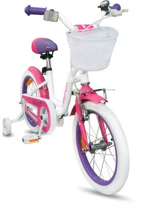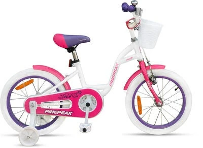 Fargerik, rosa, lilla sykkel av høy kvalitet fra Pinepeak med avtagbare støttehjul. Den har en håndbrems på forhjulet og en sykkelklokke foran. Sykkelen har en synlig refleks, en heldekkende kjedebeskyttelse, et justerbart sete og ett gir. – Ett gir– 16 tommer. – Maksimal vekt: 35 kg. – Mål: H 80 x B 46 x L 114 cm. – Anbefalt alder: fra 4 til 6 år. – 80 % metall, 10 % gummi, 10 % plast.