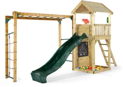 Morsomt lekestativ fra Plum i tre. Det har et tårn med en tavle og en sandkasse under, og en klatrevegg. Lekestativet har et klatrestativ og en grønn sklie. Til lekestativet medfølger også en kikkert og en leketelefon. Perfekt for mange timers morsom lek. – OBS! Baller inngår ikke. – CE-merket. – Maksimal vekt: 50 kg. – Anbefalt alder: fra 3 år. – 70 % tre, 20 % plast, 10 % metall.
