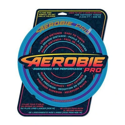 Blå AEROBIE Pro Ring 33 cm frisbee fra Sunsport med en ekstra lang rekkevidde. Perfekt til sommerens utendørsleker. – Ikke egnet for barn under 3 år