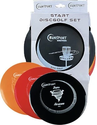 Discgolf START frisbee sett av høy kvalitet fra Sunsport med tre forskjellige Driver, Mid-range & Putter frisbeer. Perfekt til sommerens utendørsleker. – Ikke egnet for barn under 3 år